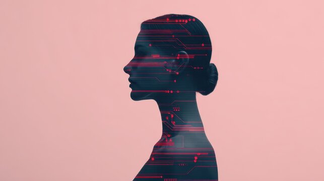 Future store design concept, Silhouette of a woman's profile filled with circuit patterns against a pink background.