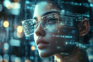 Futuristic woman wearing glasses with digital overlay.