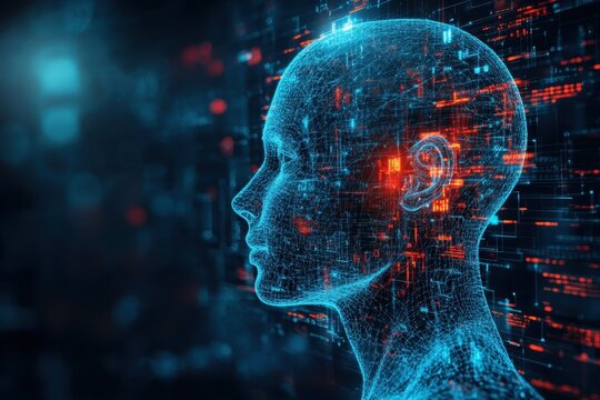 Abstract representation of a human head with glowing blue circuits and digital data streams symbolizing artificial intelligence and futuristic technology concepts