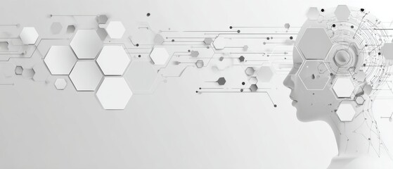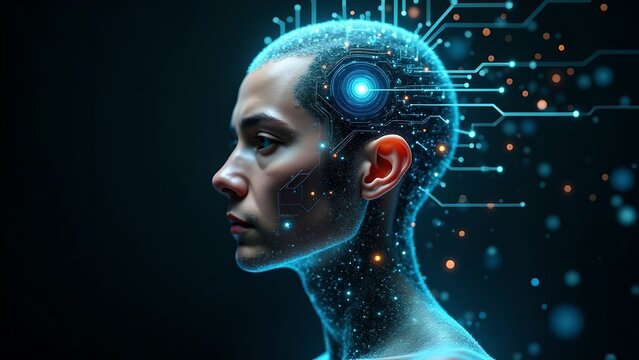 Futuristic human head with digital elements and glowing data streams in dark environment