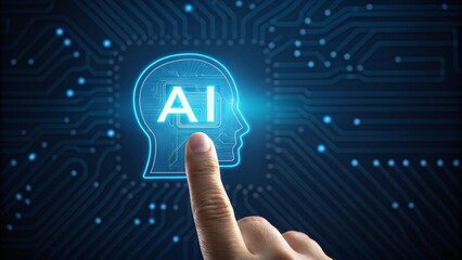 A hand interacting with a digital interface of a human head with a glowing light on a green background with various icons and symbols