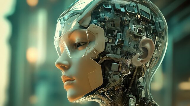 Close up view of a futuristic humanoid robot with transparent head showing internal components