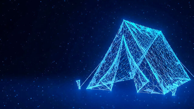 Futuristic low-poly tent illuminated with vibrant blue light, symbolizing adventure, data networks, and the future of outdoor experiences within a captivating digital cosmos.