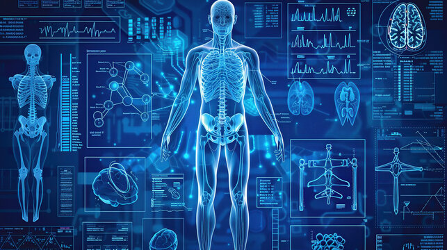 A digital blue background with an overlay of human anatomy and medical diagrams