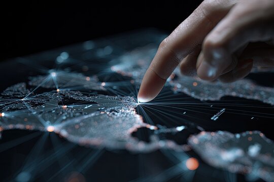 Network of connected people icons representing a social media web with a finger interacting with digital interface symbolizing global connection and user experience