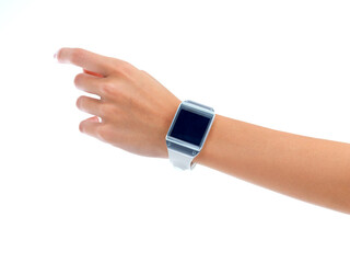 Cropped view of a woman wearing a smartwatch. The commercial product(s) or designs displayed in this image represent simulations of a real product, and are changed or altered enough so that they are