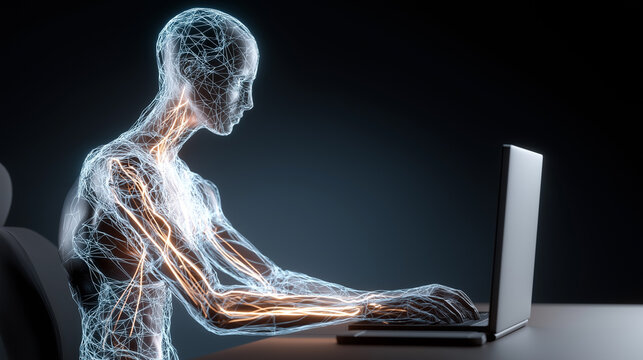 Futuristic transparent human figure working on a laptop with visible neural and data connections.