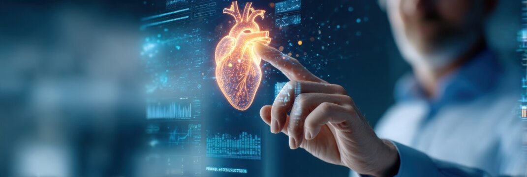 A person interacts with a digital hologram of a glowing human heart, surrounded by medical data and futuristic technology elements.
