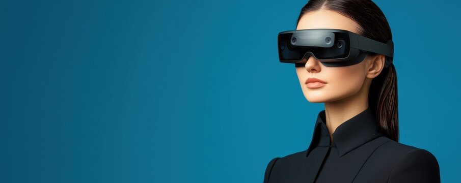 economy consumption demand concept. A woman wearing futuristic VR glasses against a blue background.