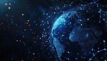 Global network of interconnectedness.  A digital globe with glowing lines connecting continents.  Abstract, futuristic, and detailed