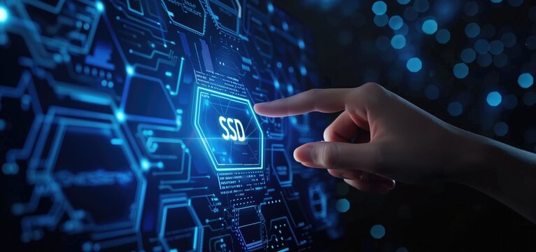 Hand pointing to digital SSD icon on futuristic virtual interface with blue lights. Solid State Drive concept.