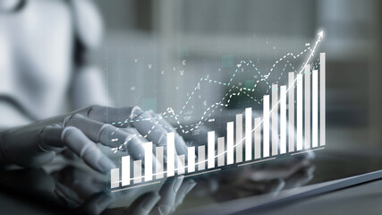 Businessman using AI technology for data analytics and digital transformation, showing futuristic virtual dashboard interface with charts, graphs, and artificial intelligence icons.