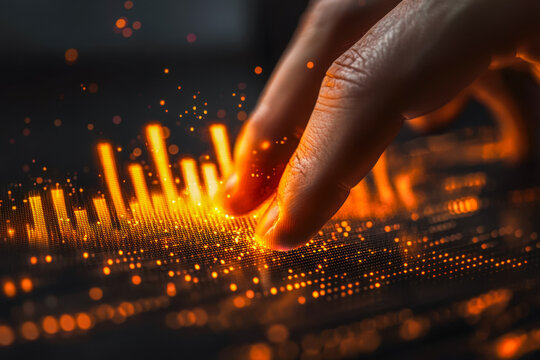 Financial growth chart visualized on a futuristic digital interface by a person analyzing data