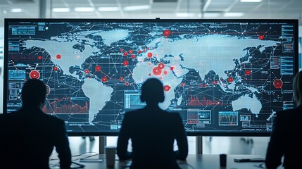 Silhouetted figures standing in front of a high tech global data network with 3D data visualization and interactive digital analysis elements creating a futuristic and innovative scene