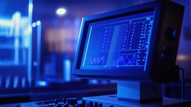 High tech laboratory screen displays complex data and graphs. The blue lit environment emphasizes a scientific and technological atmosphere, ideal for research and analysis