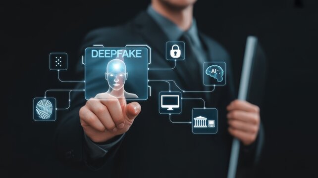 Navigating Deepfake Technology: A person in a business suit interacts with a digital interface, highlighting concerns of deceptive media.