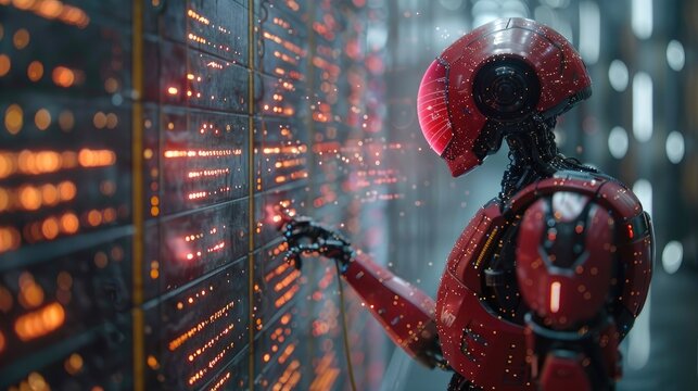 A futuristic AI robot interacting with digital panels in a high-tech server room, highlighting advanced technology and innovation.