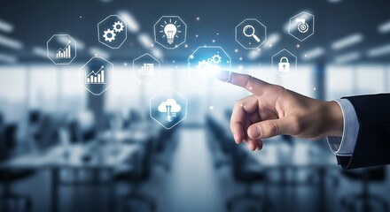 Hand touching digital icons interface in a modern office environment with blurred background view