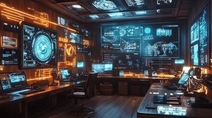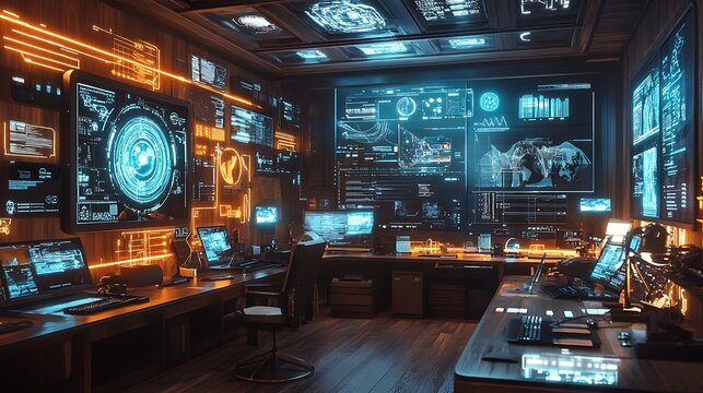 Futuristic control room with multiple computer screens displaying data and information.