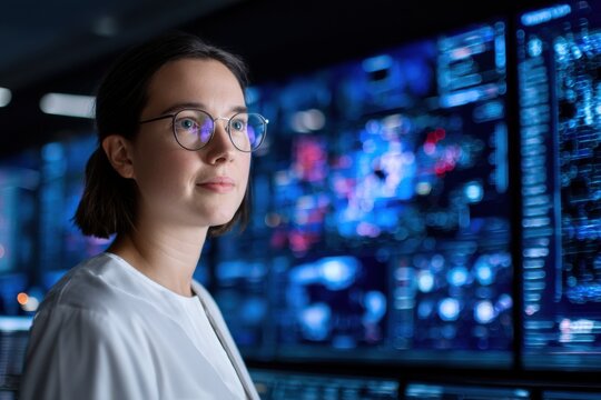 A focused woman with glasses studies complex data on multiple digital screens in a high-tech control room or data center environment.