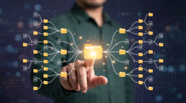 A man interacts with a futuristic digital file system, representing modern data management and connectivity in a professional setting.