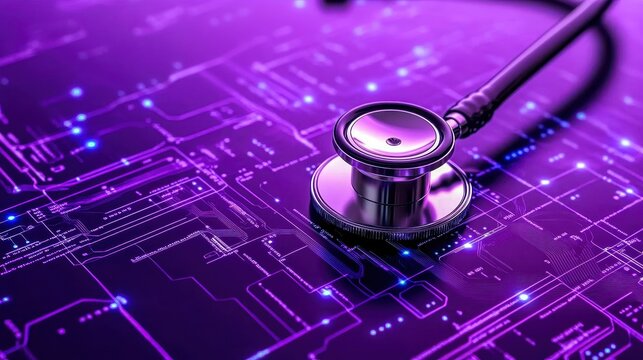 Stethoscope on a futuristic digital background with purple hues and circuit patterns.