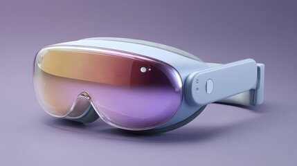 Sleek futuristic VR headset with reflective purple-tinted visor and adjustable head strap on a soft purple background, futuristic AI headset