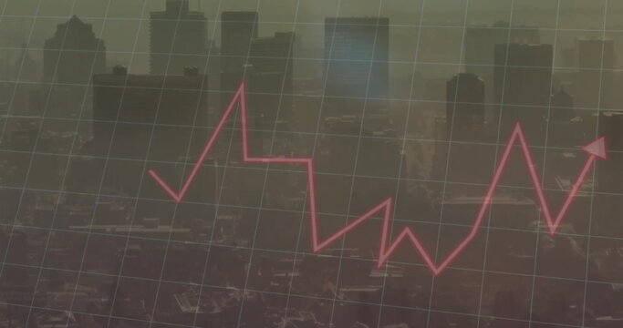 Displaying numeric stock prices floating over city skyline, with arrows, gridlines and line charts