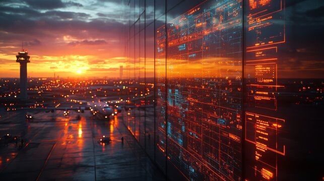 A holographic interface monitors air quality, showcasing vibrant data against a sunset backdrop over an urban airport, creating a high-tech atmosphere.