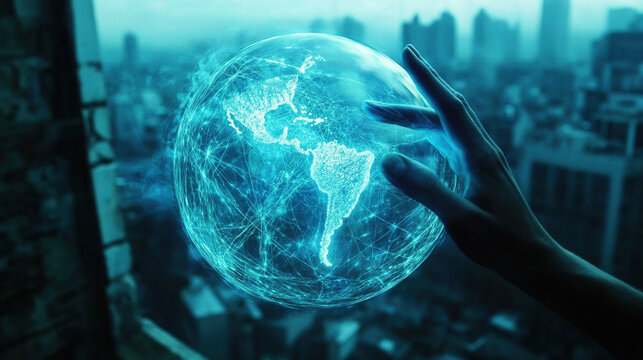 Illuminated global network manipulated by hand over urban cityscape backdrop