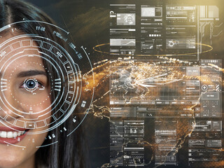 Asian women being futuristic vision, digital technology screen over the eye vision background, security and command in the accesses. surveillance and sefety concept