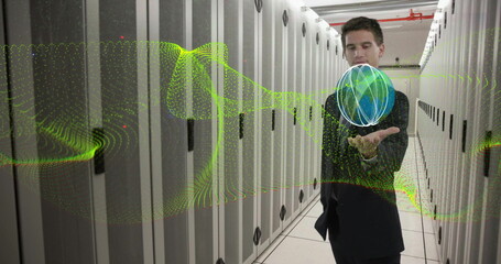 Image of yellow network wave over caucasian businessman with global network in server room
