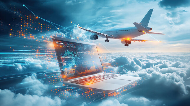 3D rendering of an airplane flying over a laptop with a digital data and cloud technology background concept