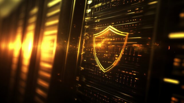 Shield Icon on Server Rack with Dramatic Lighting