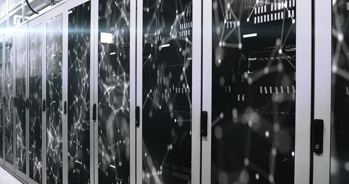 A futuristic data center with a person interacting via holographic interface showing user icons and a checkmark over a server rack in a sleek, modern room
