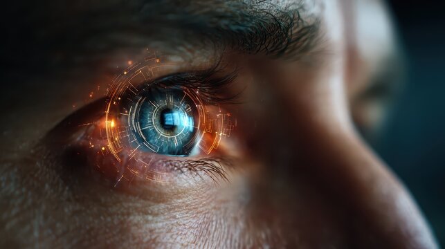 Close-up of a human eye with futuristic digital interface overlay and glowing elements