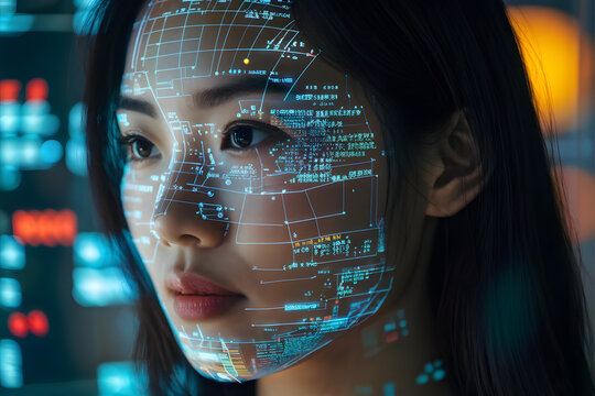 A close-up shot of a person with data code projected onto the face, digital world concept, with eyes filled with light and technology.