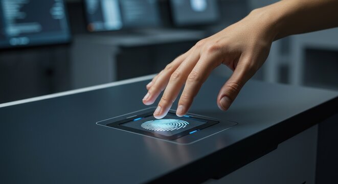 Fingerprint scanning on a futuristic biometric scanner for security and identification.