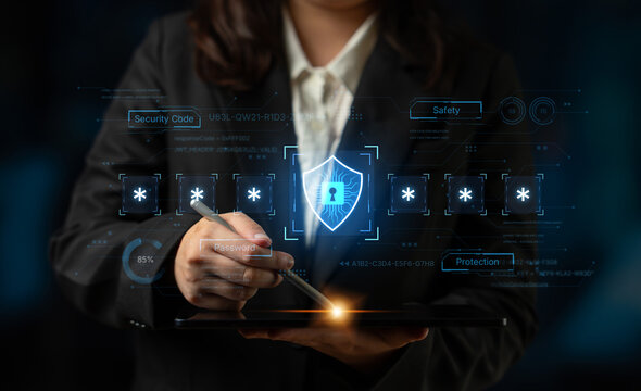 A concept of an advanced cybersecurity system. The futuristic interface shows a multi-factor authentication process using a secure password or PIN for enhanced data protection. Fermion