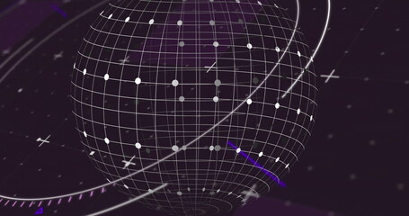 Rotating 3D wireframe sphere in digital interface with grid lines, circular nodes and orbital rings