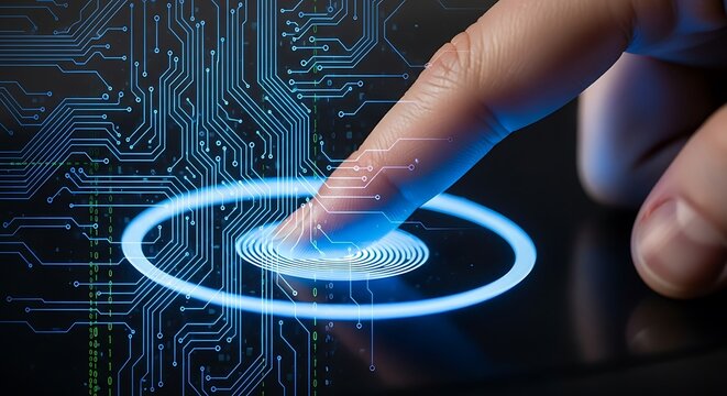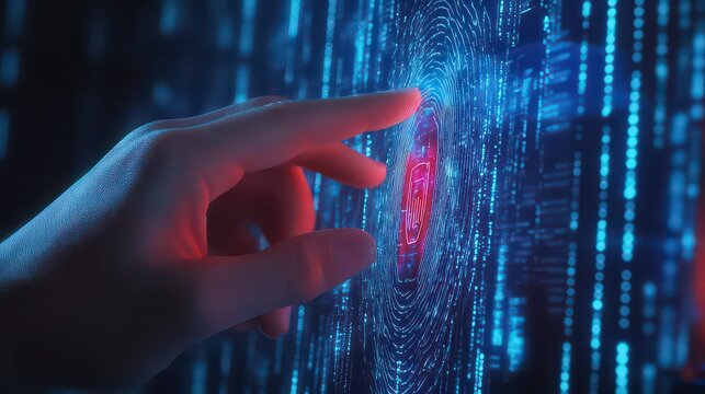 Finger touching digital fingerprint scan on glowing blue screen with binary code background