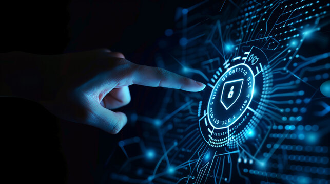 A hand is pointing at an abstract shield with binary code on it, symbolizing digital security and data protection. The dark blue background has futuristic elements like circles or lines in the shape o