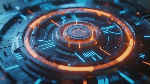 Futuristic circular interface with glowing orange and blue circuit patterns, resembling advanced technology or artificial intelligence system.