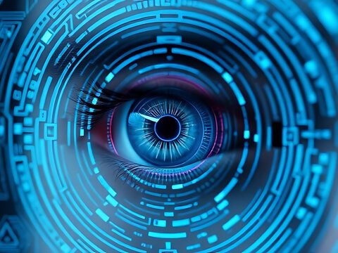 A closeup of a human eye with a digital interface overlayed on top, creating a futuristic and technological aesthetic, with intricate blue circuit patterns and glowing elements enhancing the eyes natu
