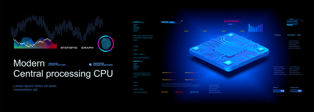 Powerful computer processor. The central processor in axonometric projection. Presentation of the new generation processor. Conceptual cyber banner with HUD elements