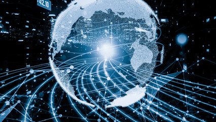 Futuristic global network and tacit digital data transfer 3D graphic . Concept of smart digital transformation and technology disruption that changes global trends in new information era .