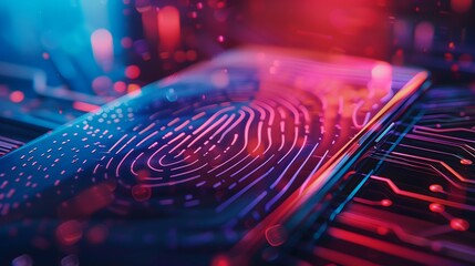 A glowing fingerprint scan on a futuristic digital interface with neon lighting