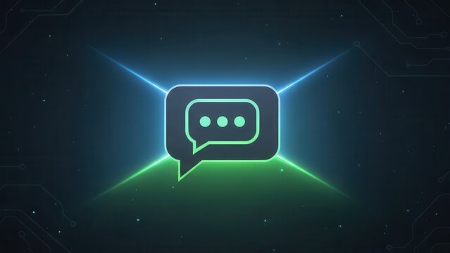 Neon green and blue glowing chat on dark background with circuit lines speech bubble