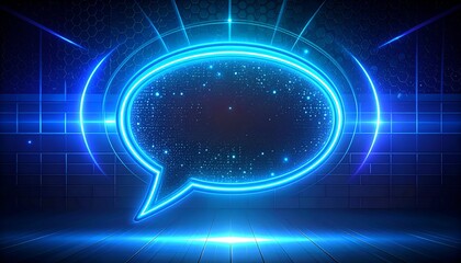 Glowing blue speech bubble with digital particles, framed in neon, on a dark futuristic backdrop