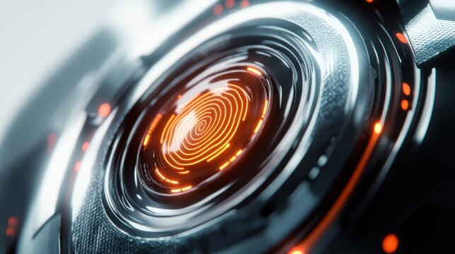 Close-up of a futuristic, metallic, circular device with glowing orange spiral.